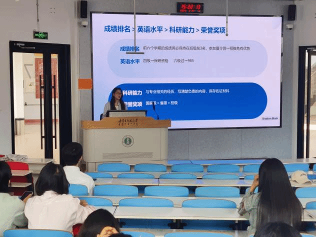 在经验分享环节,与会的应届毕业生们围绕自身经验针对综合评估个人能力、院校选择、专业排名、积极参加科研竞赛、备考复习等方面进行分享。与会的大二同学们踊跃提问,与发言同学展开深度的交流。