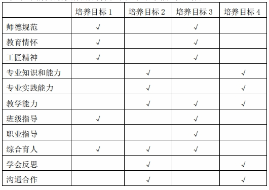 目标1:热爱祖国,拥护中国共产党的领导,践行社会主义核心价值观;热爱教育事业,贯彻党的教育方针,始终坚持立德树人;遵守教师职业道德规范,具有依法执教意识,有强烈的社会责任感和事业心;尊重学生人格,关爱学生,成为学生锤炼品格、学习知识、创新思维和奉献祖国的引路人。